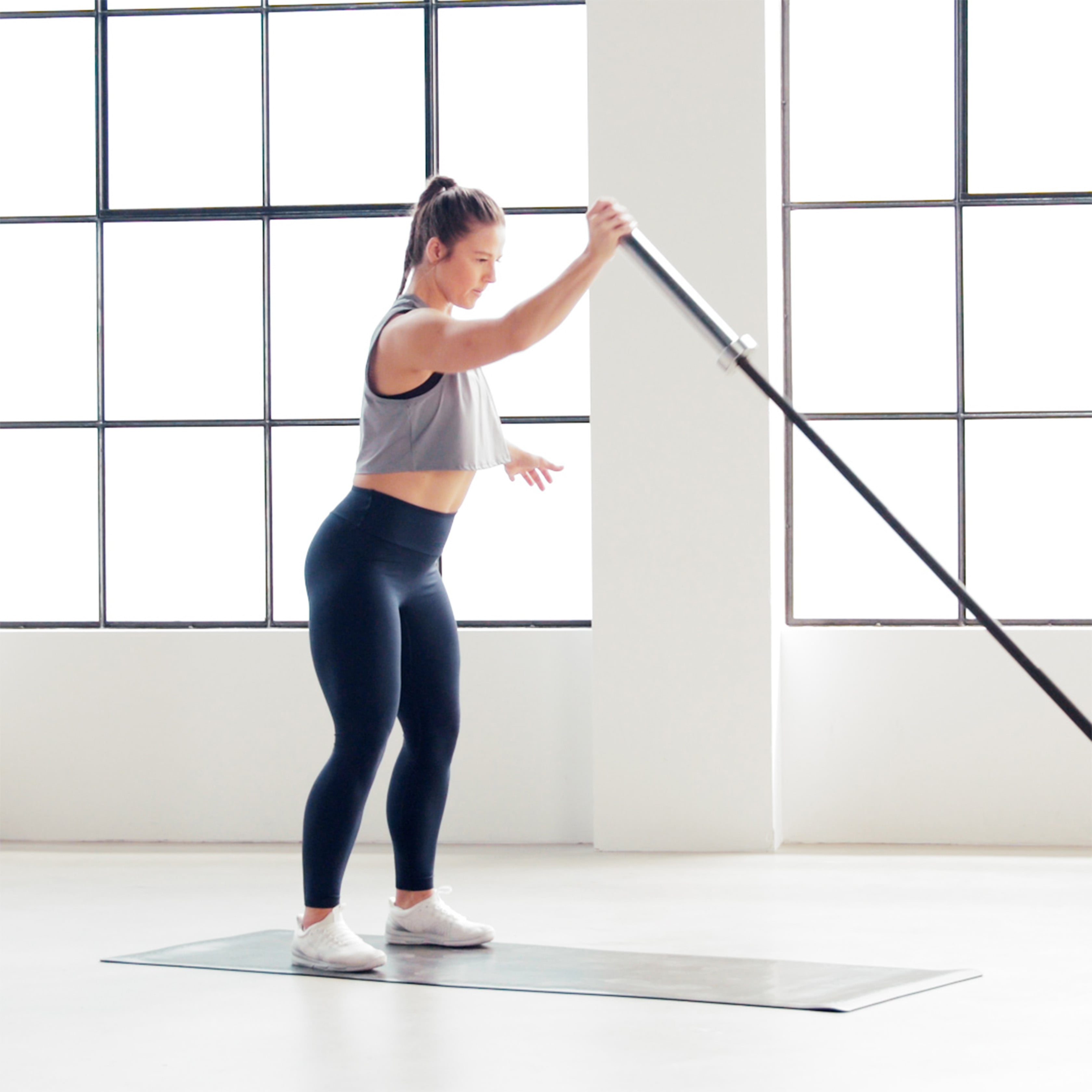 Take a deep breath into your belly and brace your core, ensuring your back is straight.